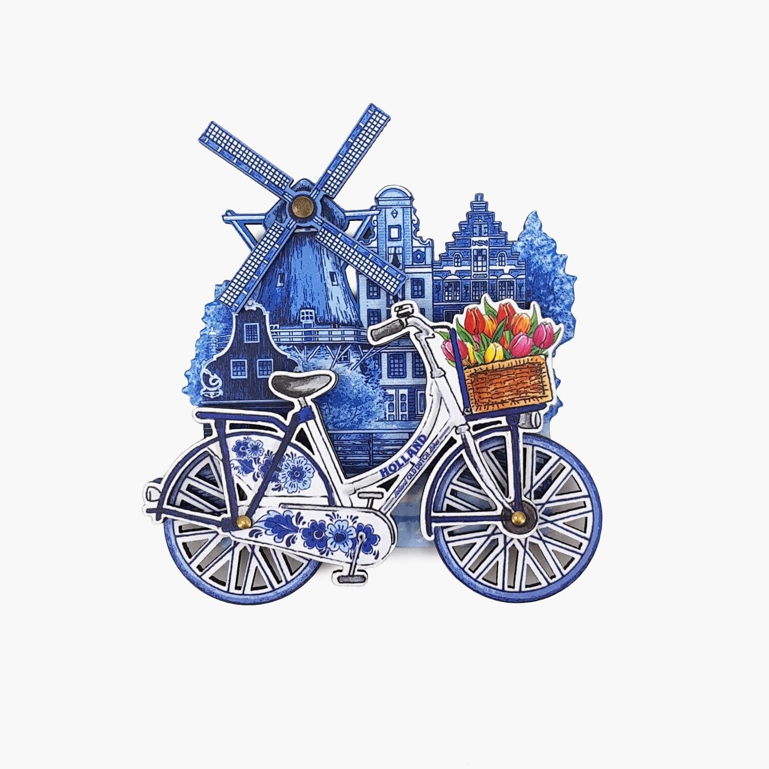 12076 - Magneet mdf draaiende wielen en molen Holland - delftsblauw