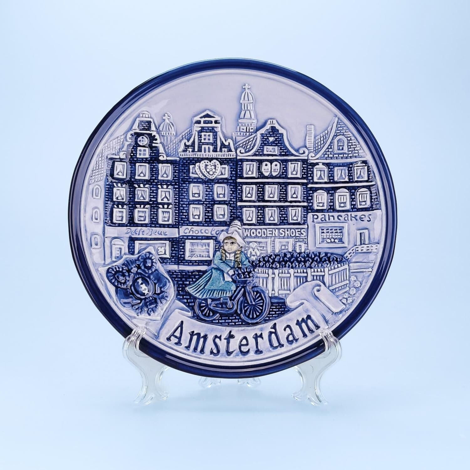 2104 - Bord huisjes met fiets 15 cm Amsterdam - delftsblauw